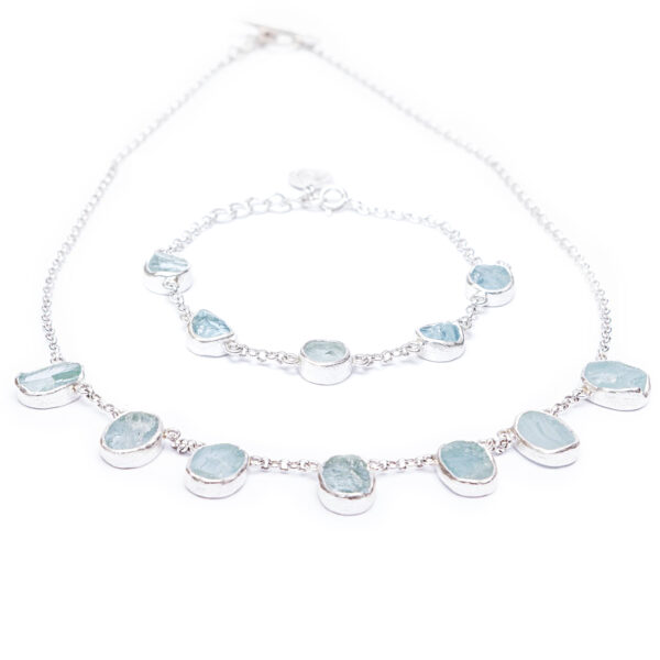 A very beautiful and unique handmade Aquamarine gemstone necklace and bracelet jewellery set with natural rough cut Aquamarine gemstones in a brushed sterling silver setting… … exclusive unique pieces to treasure and enjoy for years to come.