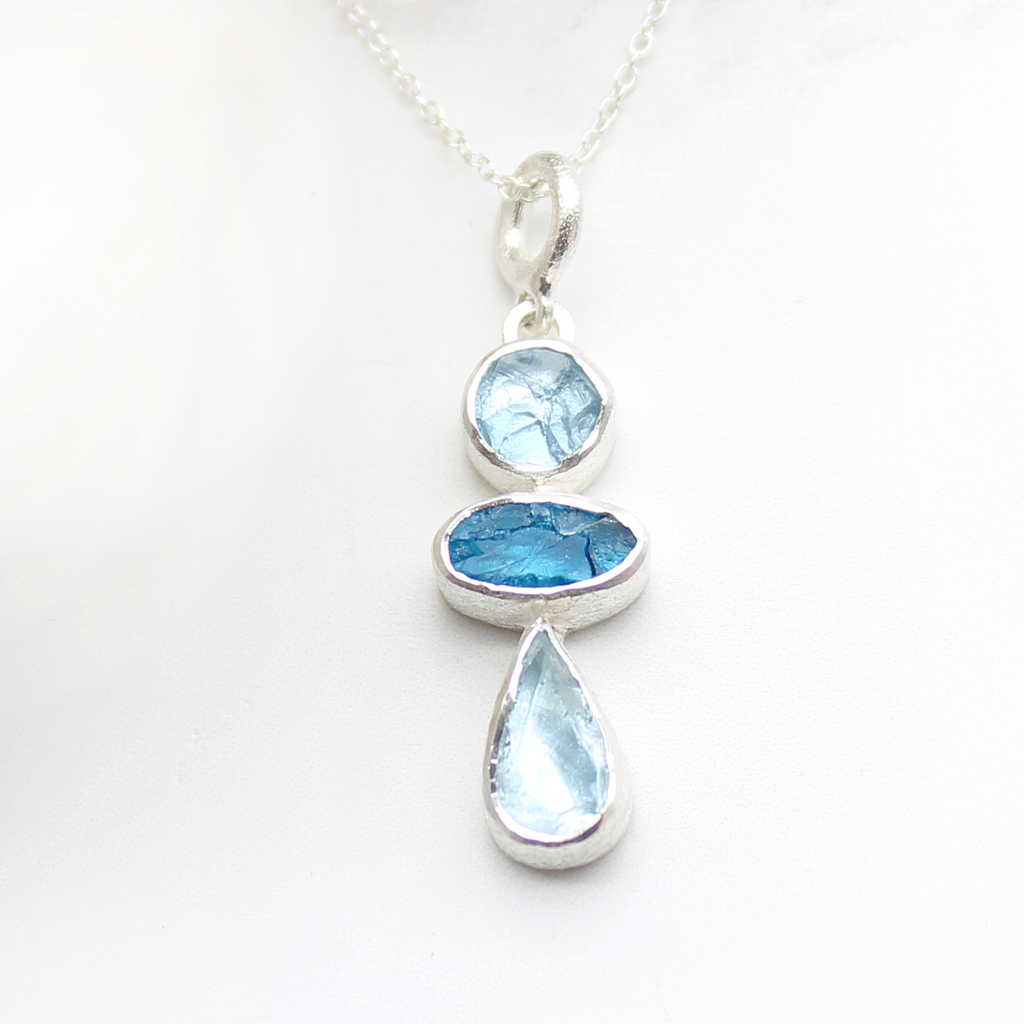 Inspired by the colours of the beautiful Moray Firth Coast in Scotland this handmade ladies gemstone pendant is set with natural rough cut Neon Apatite & Aquamarine gemstones in a brushed sterling silver setting.